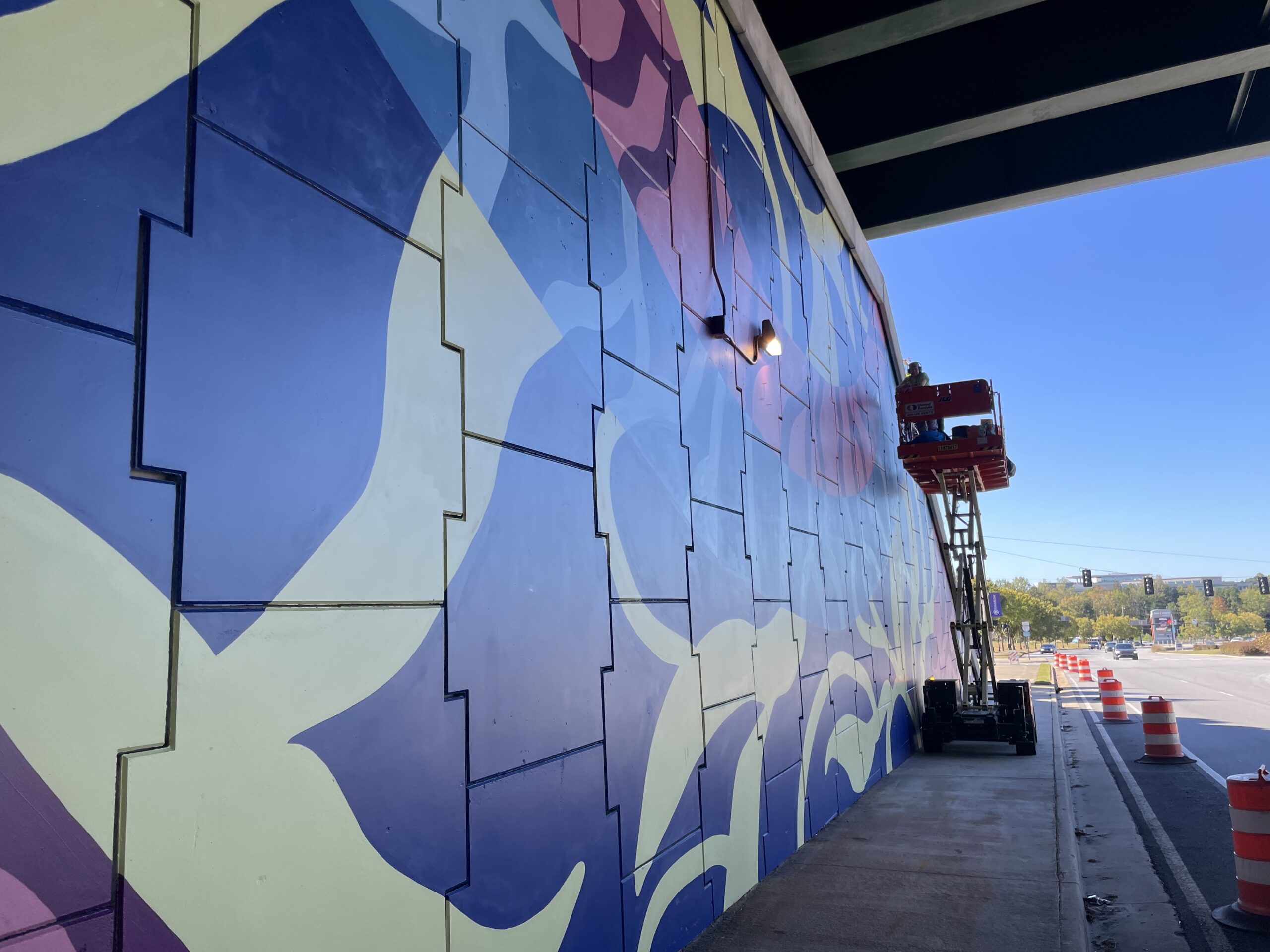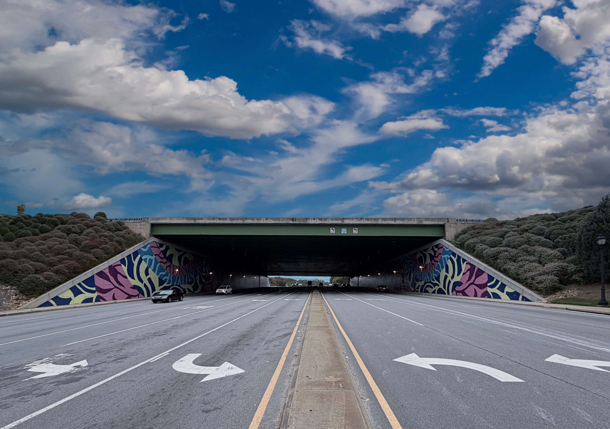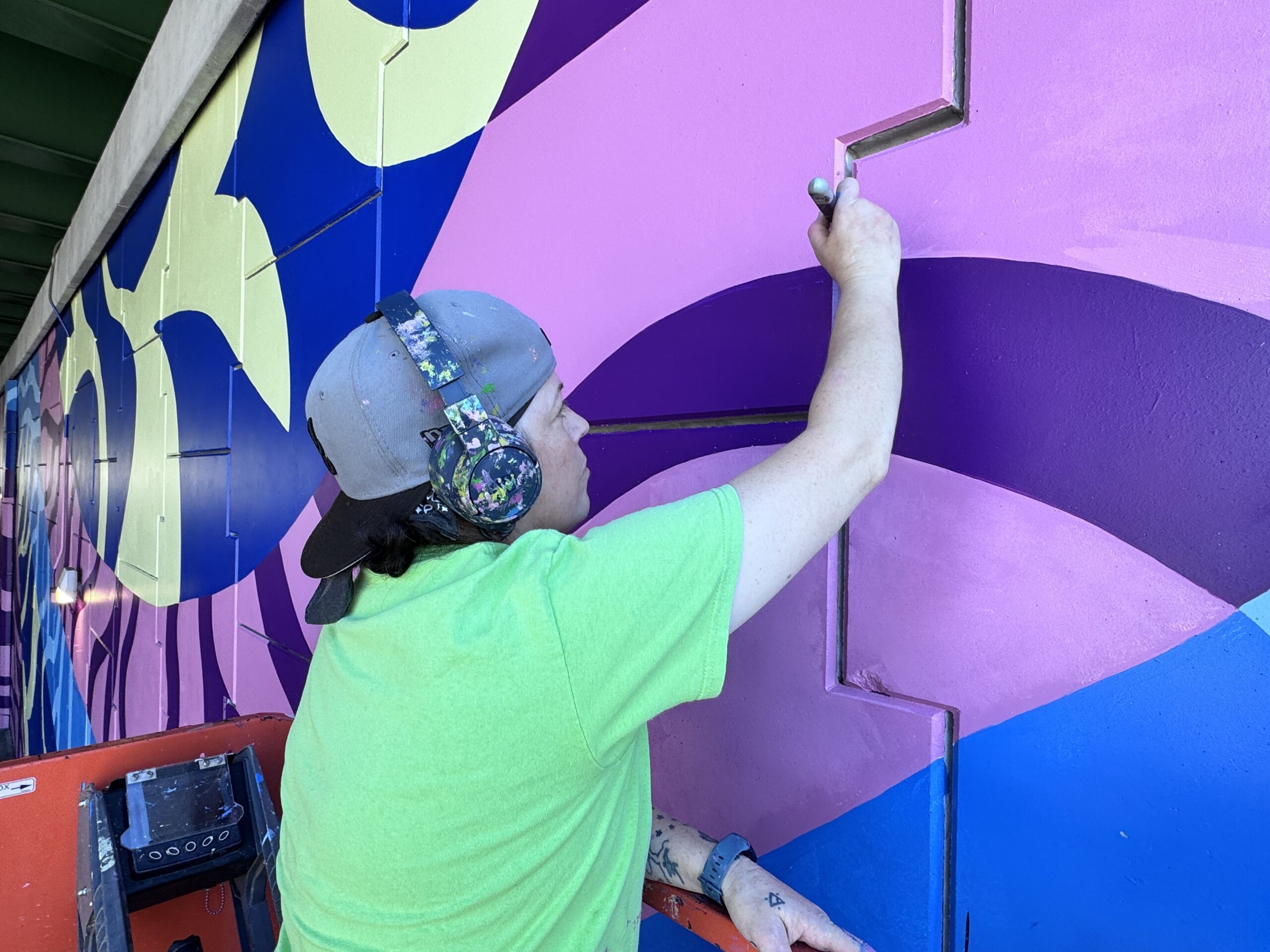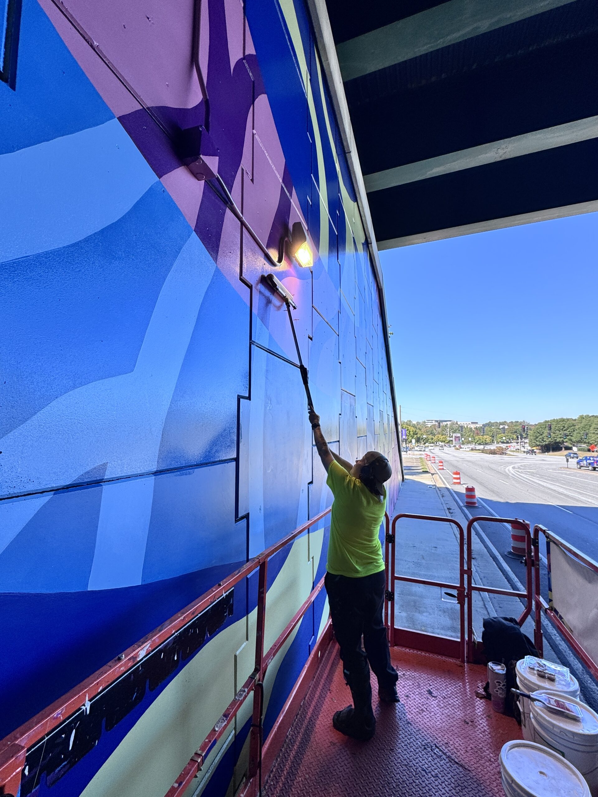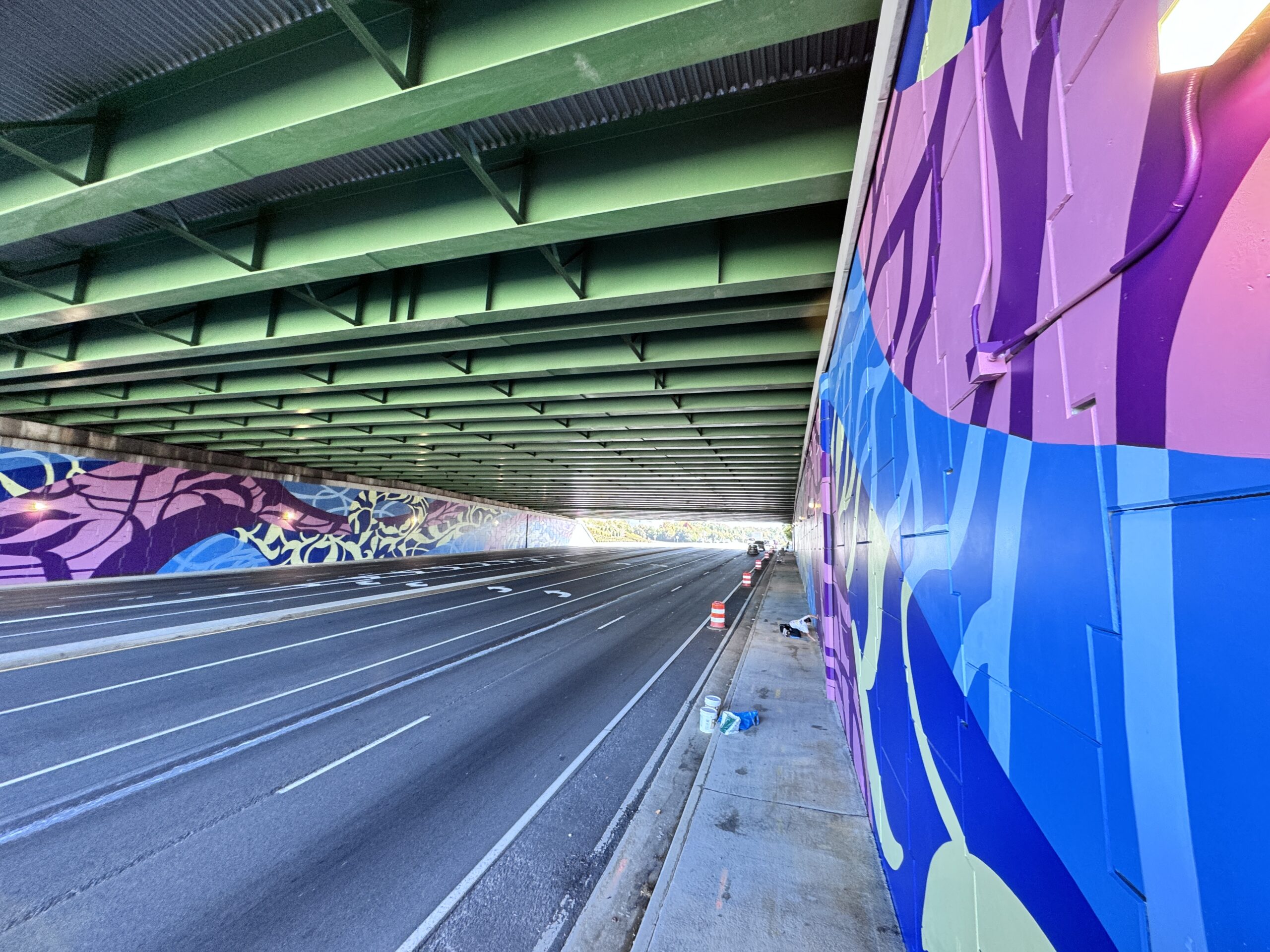 Spanning both sides of the underpass, the murals surround drivers and pedestrians with sweeping patterns of color inspired by nature, movement, and the area’s vitality. Each section was designed by Jones and completed in two phases—the North Wall in July 2024 and the South Wall in October 2025.
