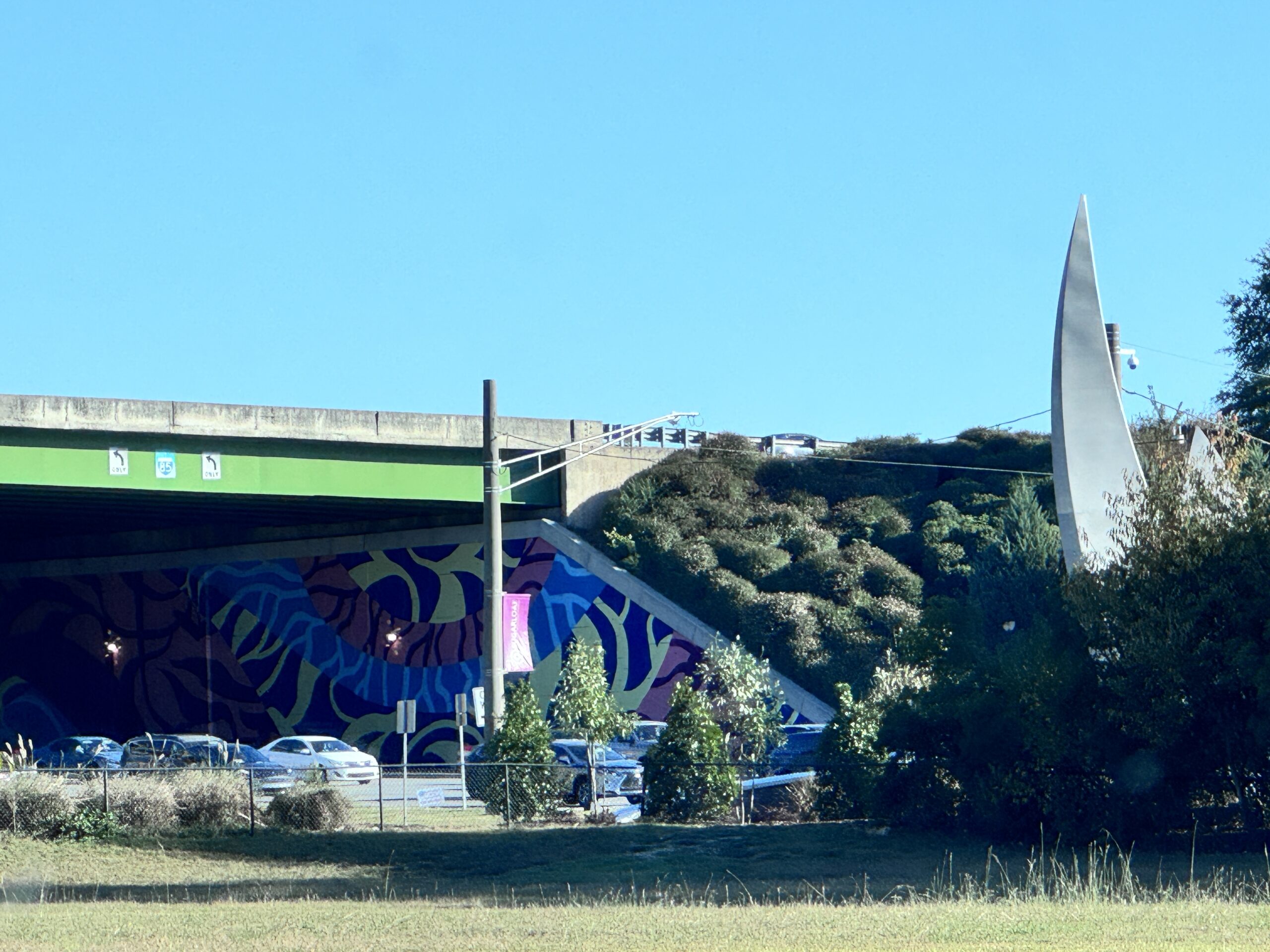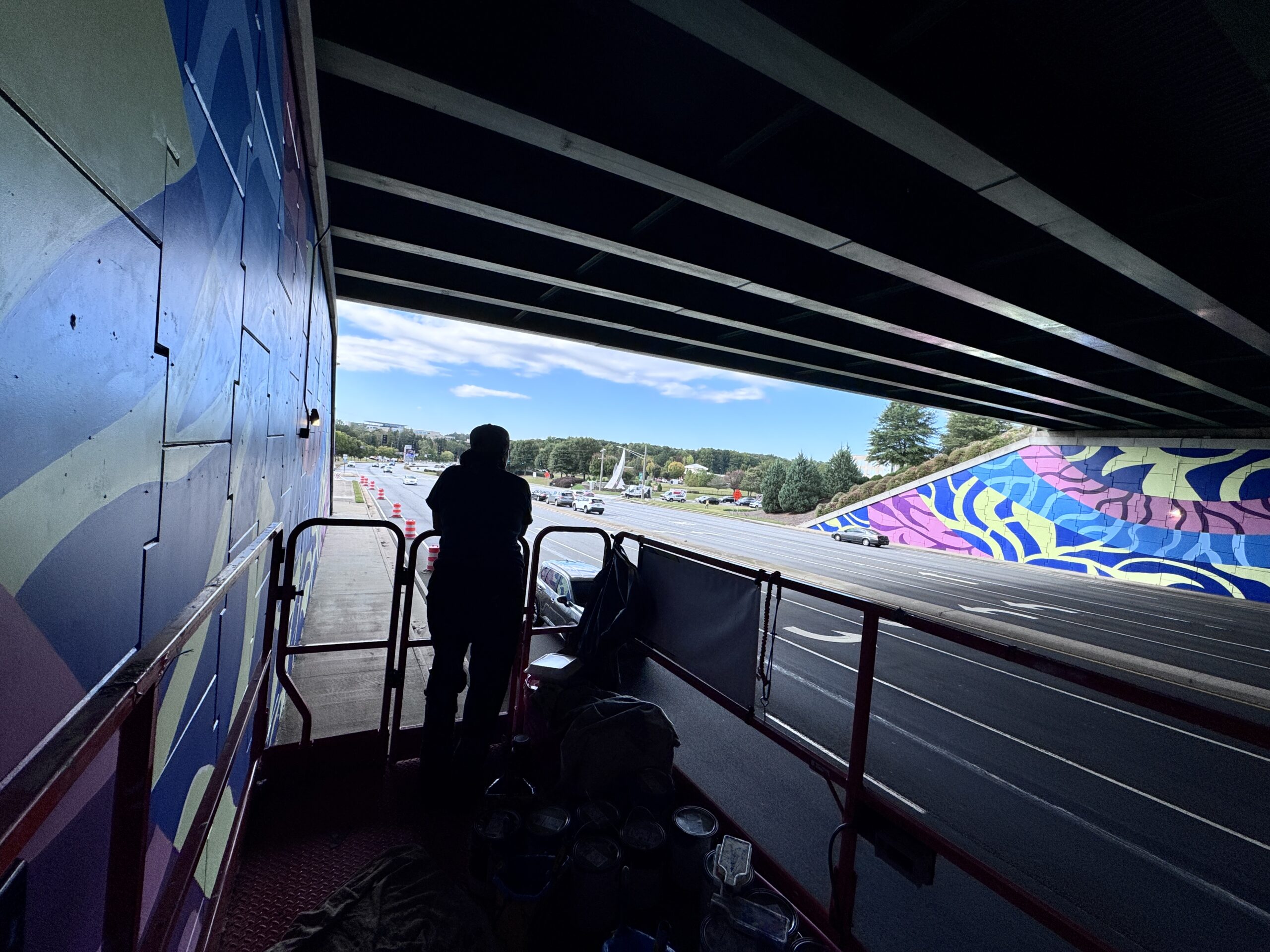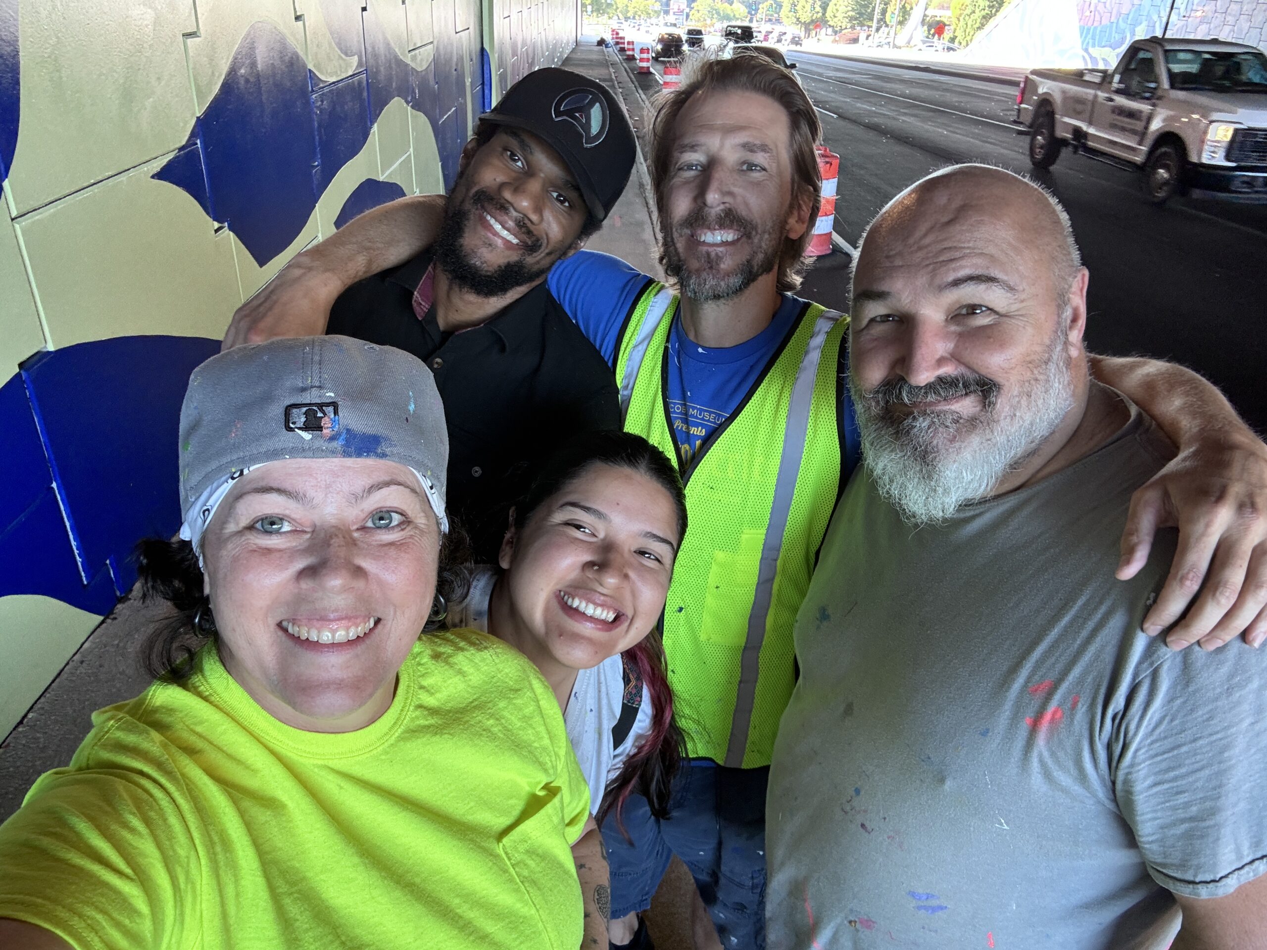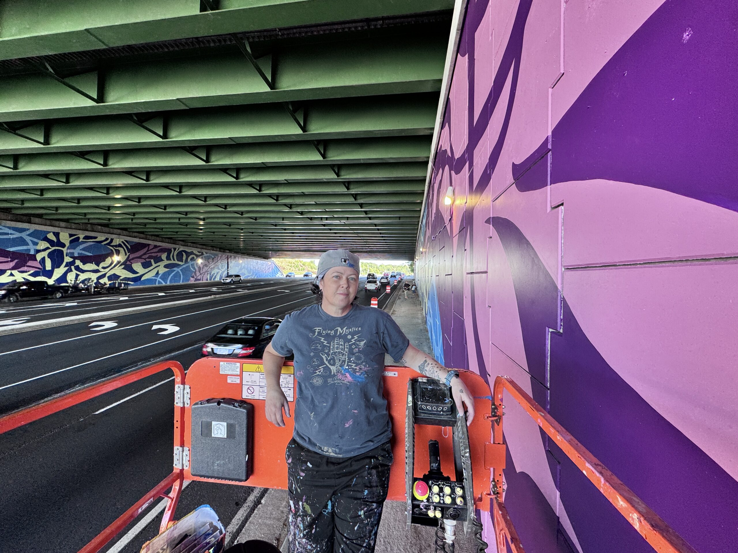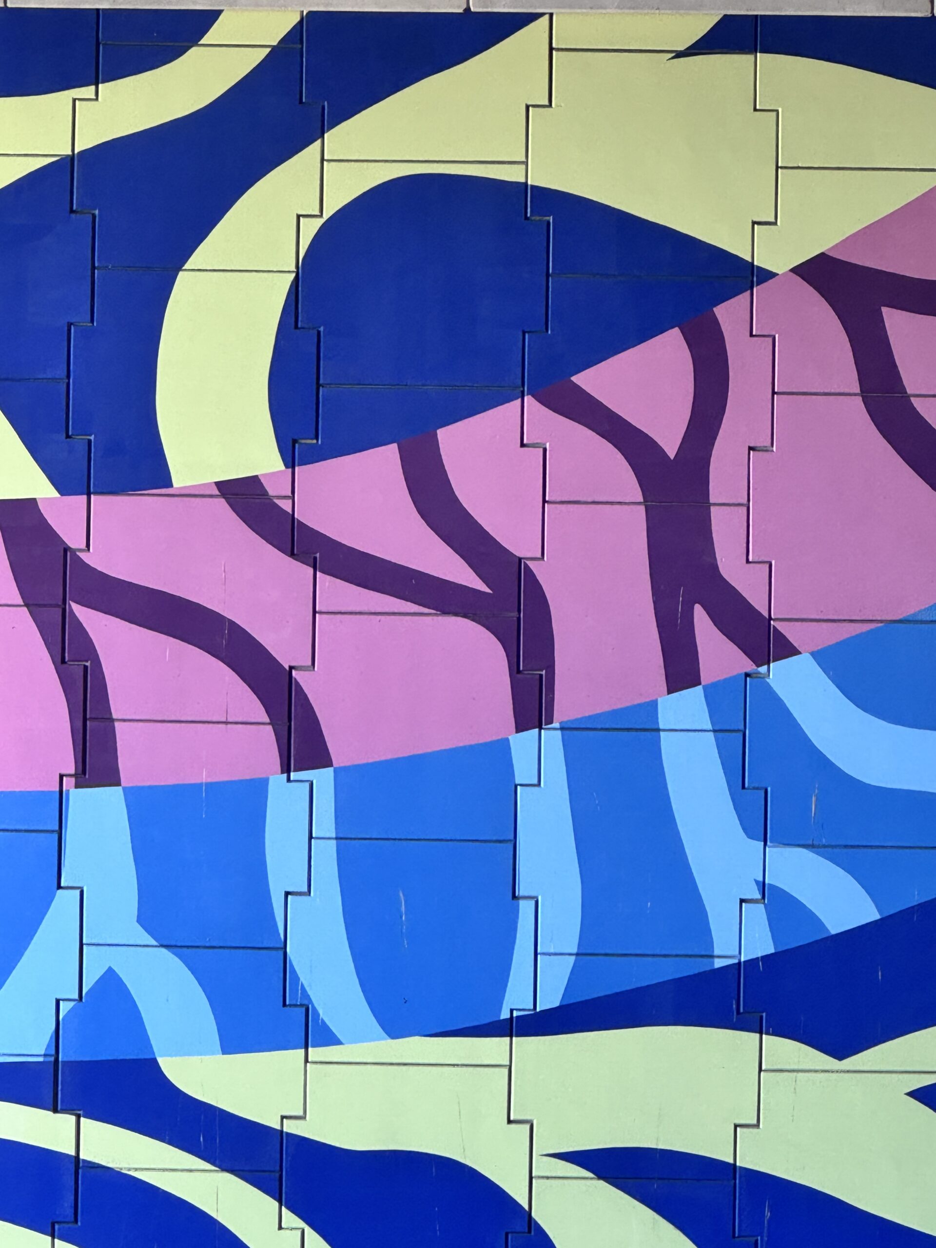 Spanning both sides of the underpass, the murals surround drivers and pedestrians with sweeping patterns of color inspired by nature, movement, and the area’s vitality. Each section was designed by Jones and completed in two phases—the North Wall in July 2024 and the South Wall in October 2025.