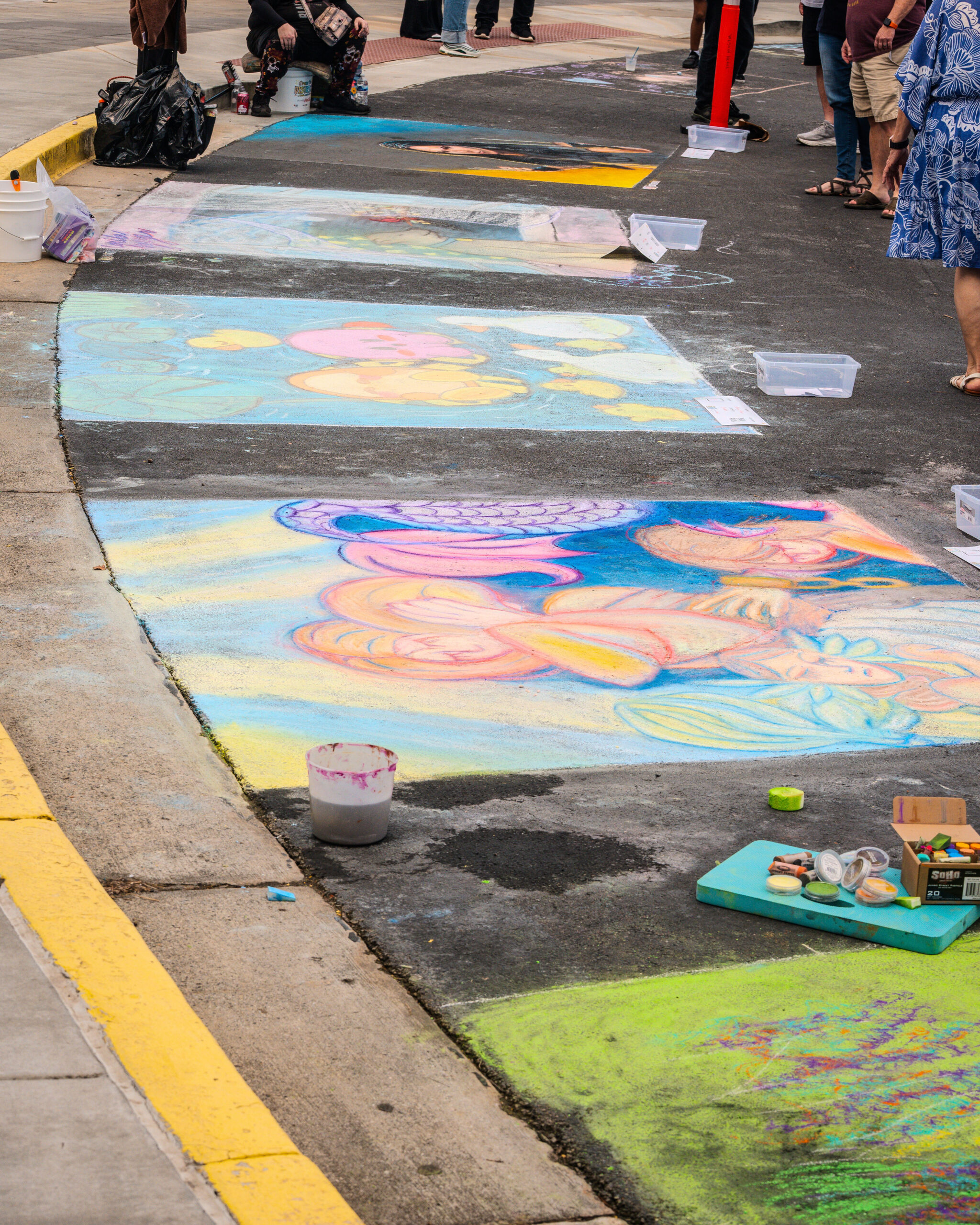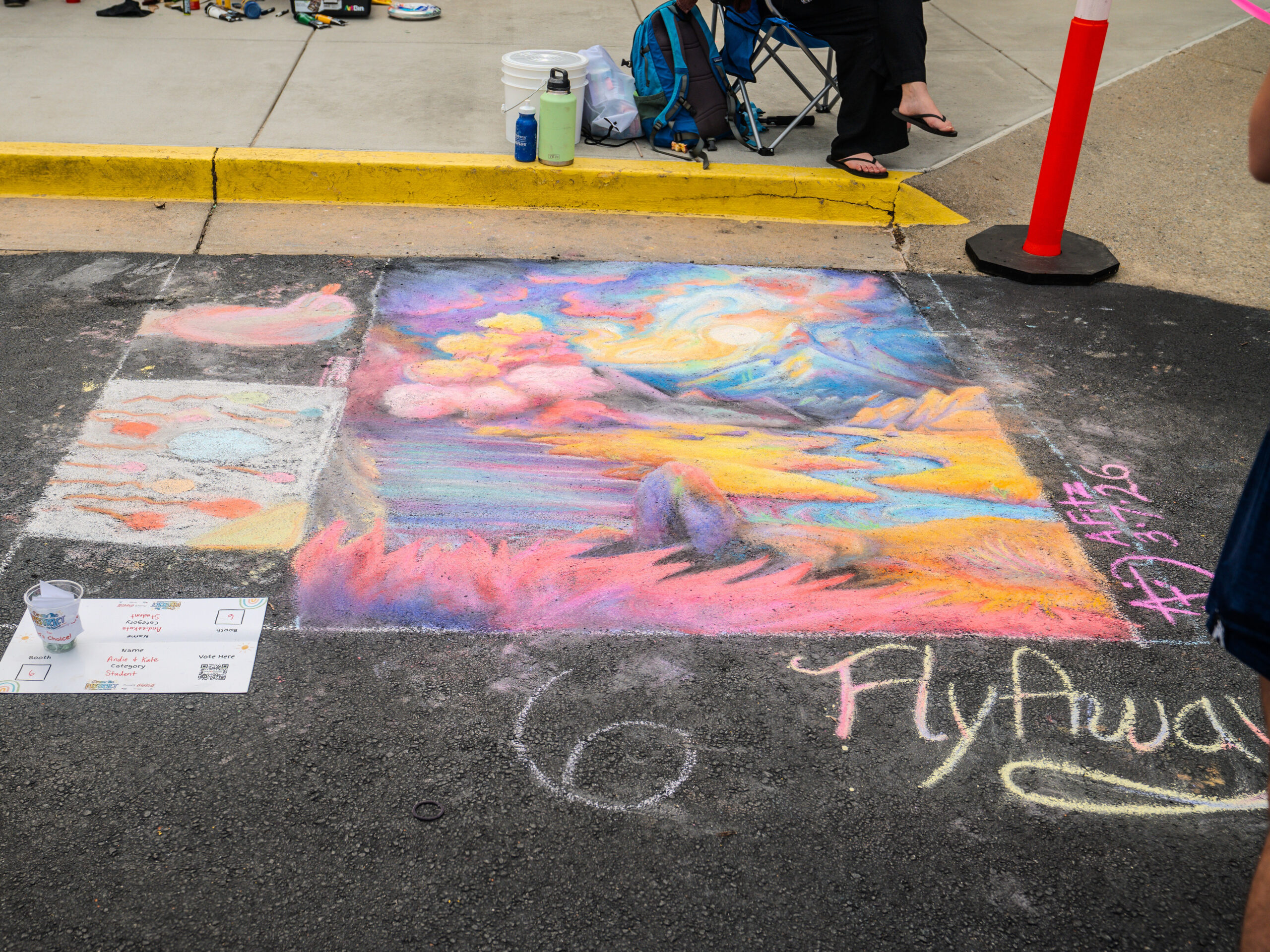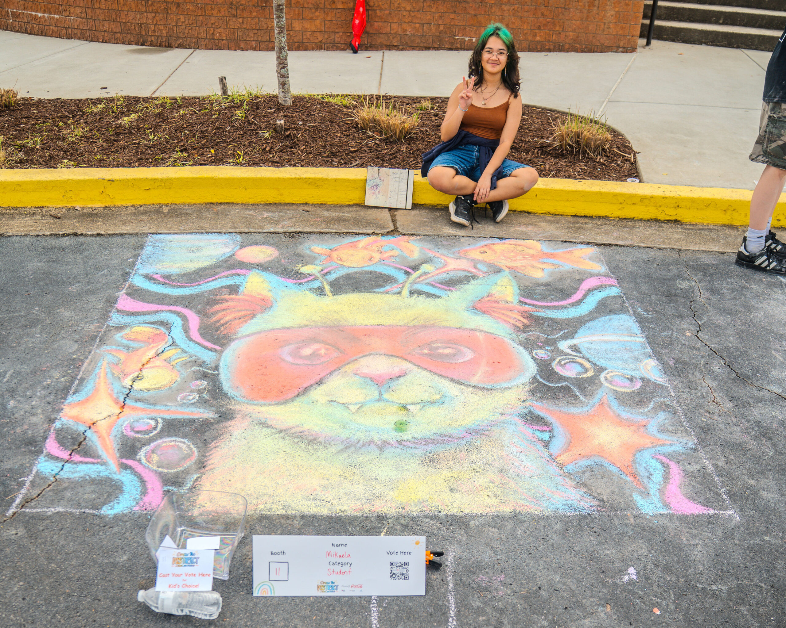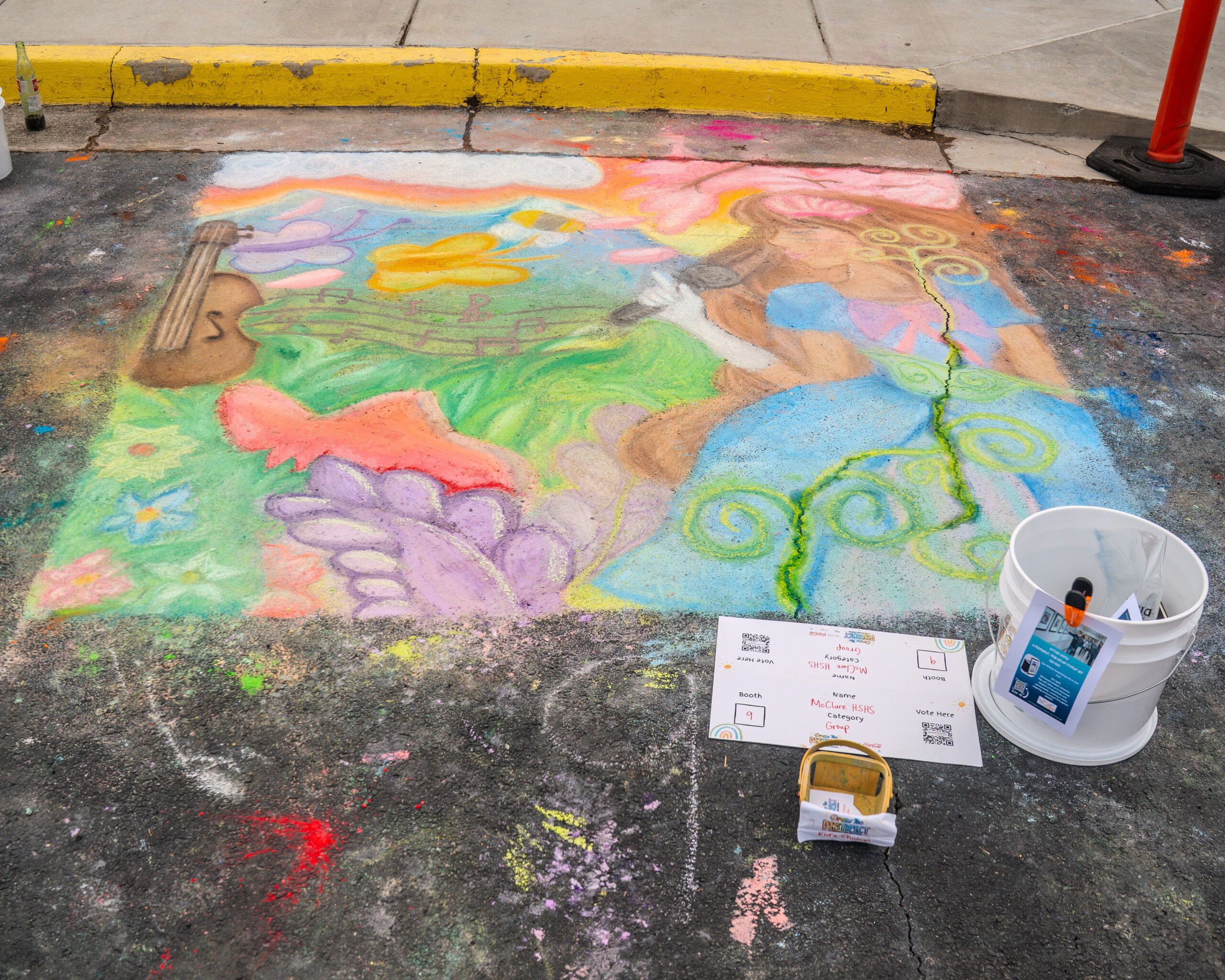 With over 35 artists competing in over 25 chalk entries as individuals, students, or groups, our judges enjoyed reviewing and scoring in the previous categories using a custom app built by local art advocate and event volunteer, Aura-Leigh Sanders. The People’s Choice category was determined by attendees scanning QR codes at each of the chalk squares to vote for their favorite. The Kid’s Choice category engaged our younger event attendees by having children drop a physical ticket in the bucket of their favorite chalk square.
