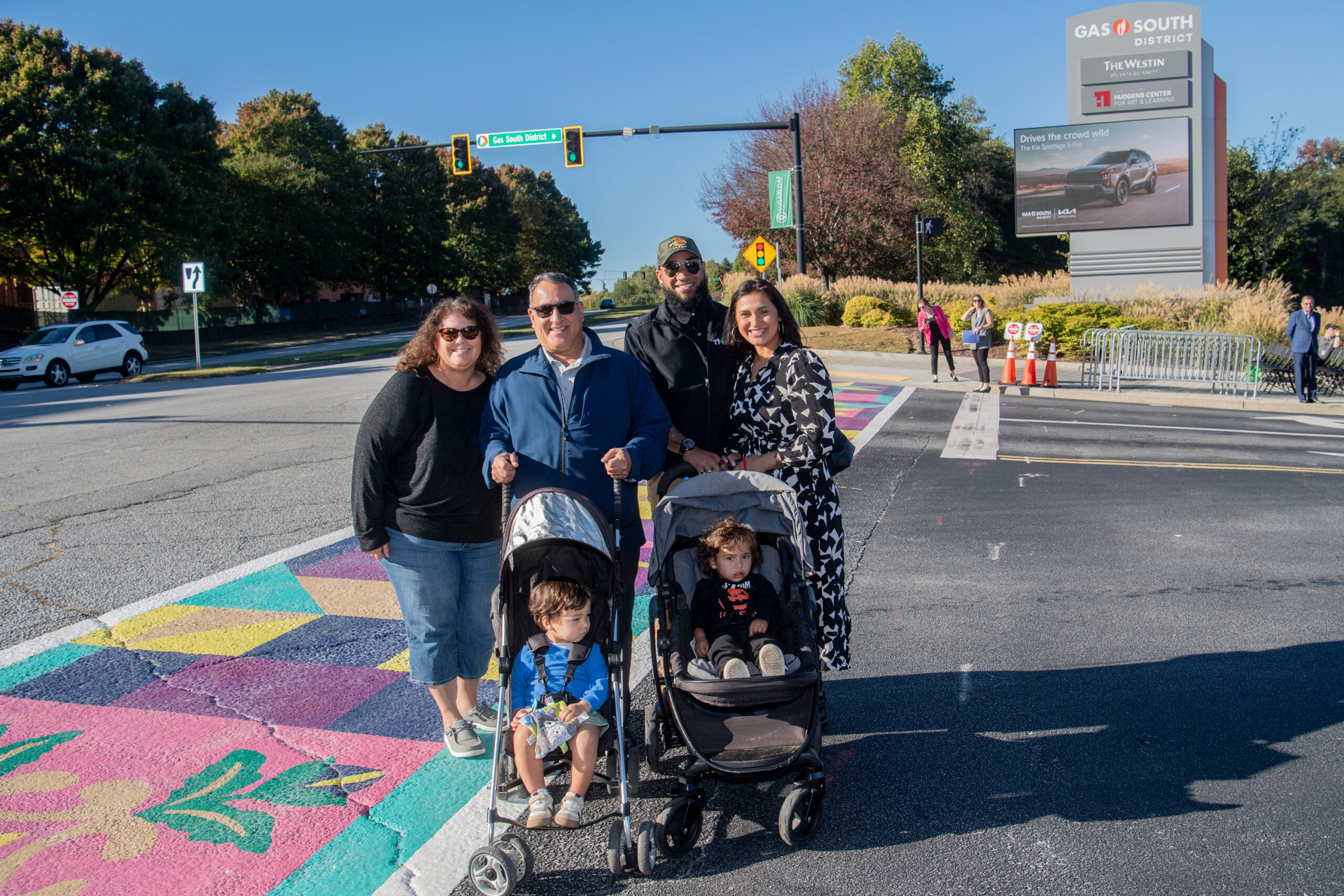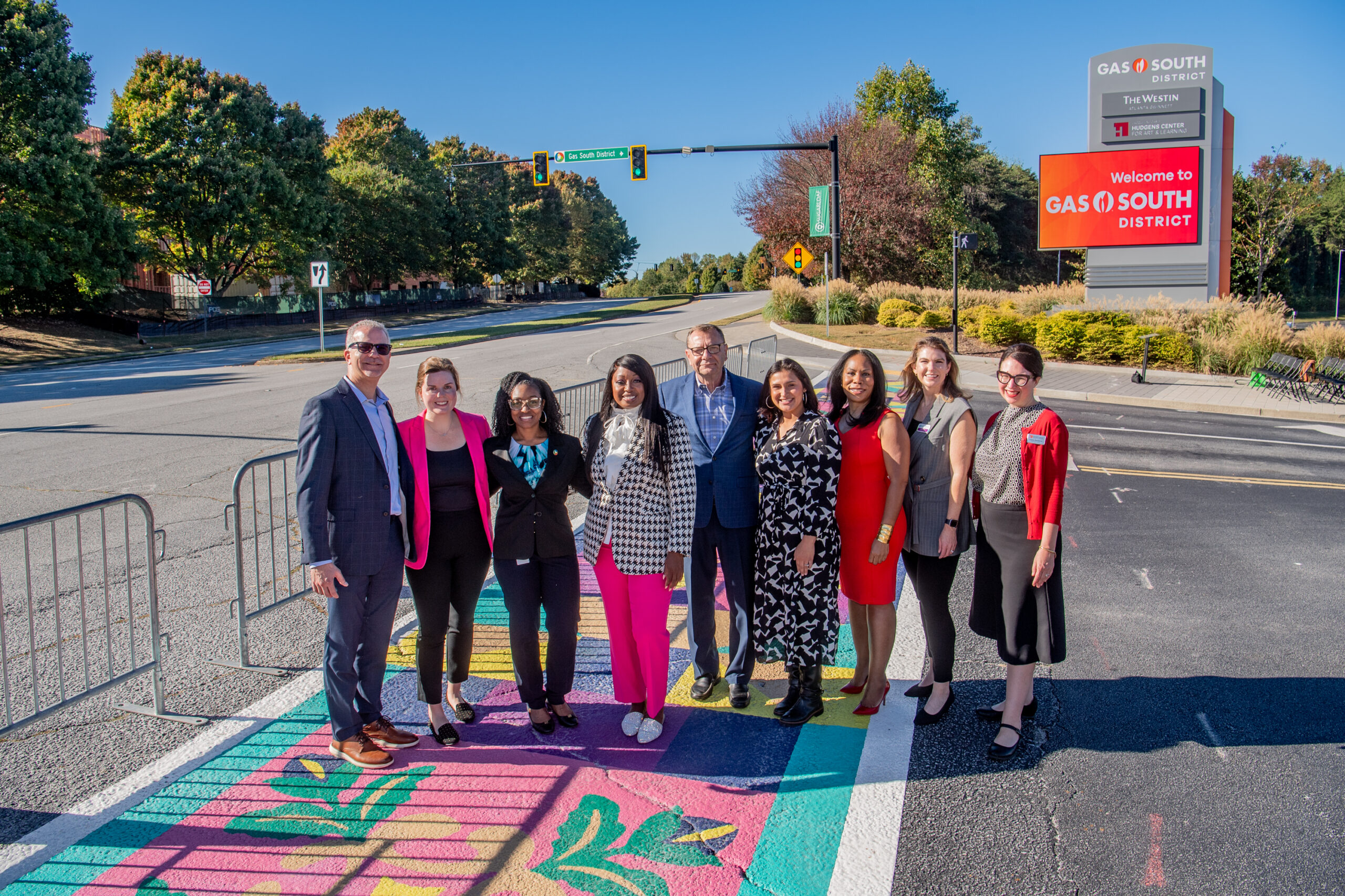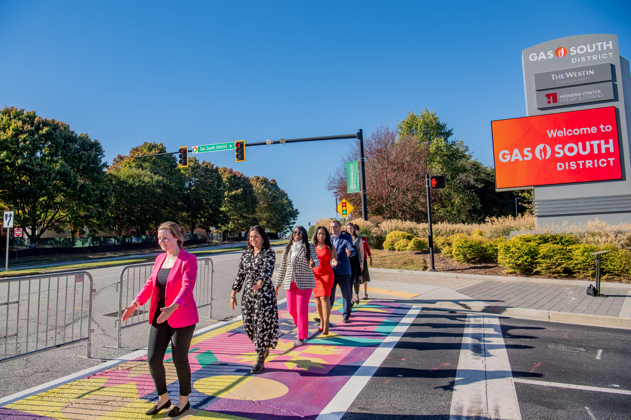 The crosswalk adds vibrancy to Satellite Blvd., improves safety and visibility for pedestrians and transit riders, and also serves as a symbolic gateway to the diverse programming and cultural experiences offered year–round at Gas South District.