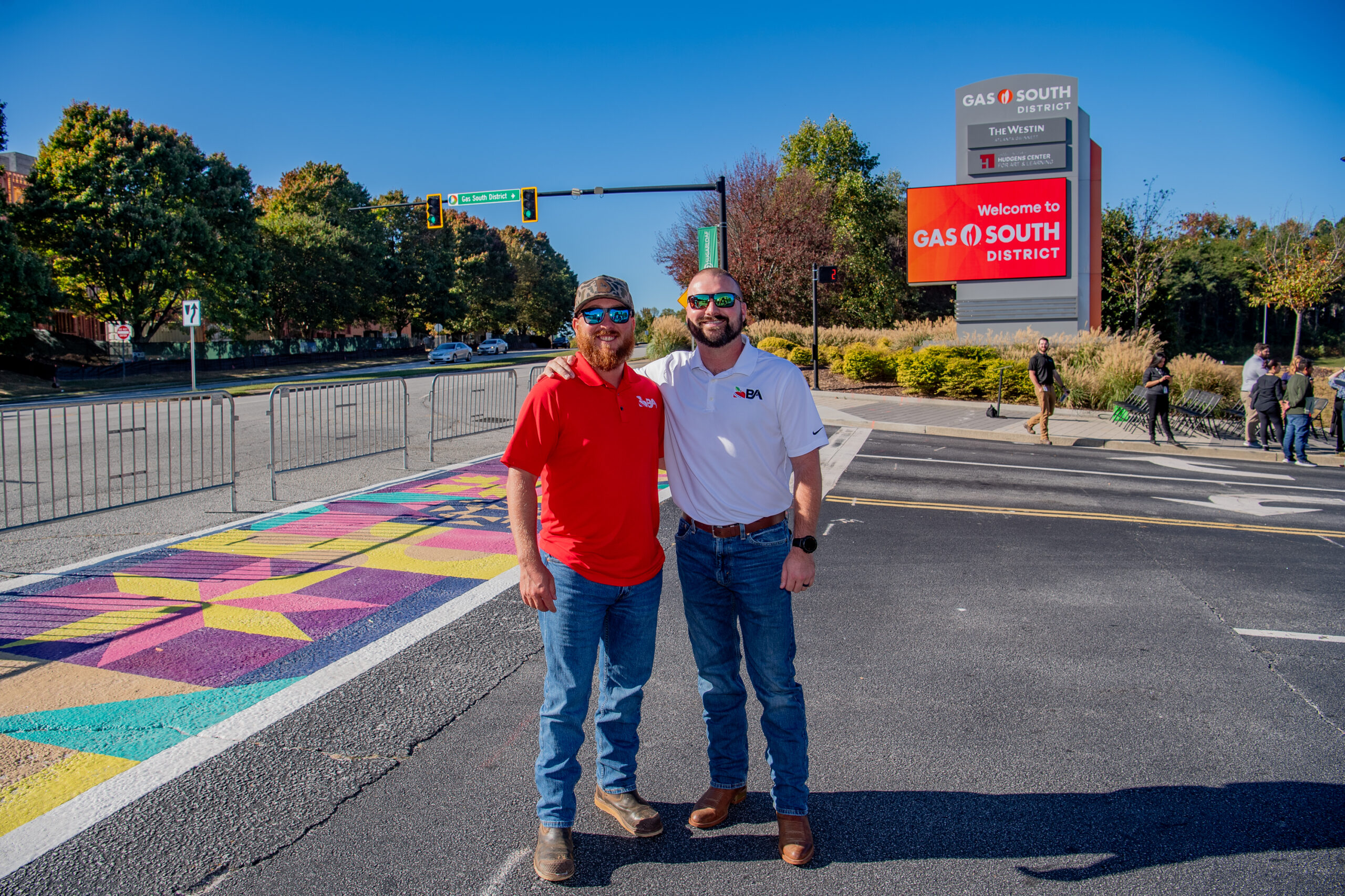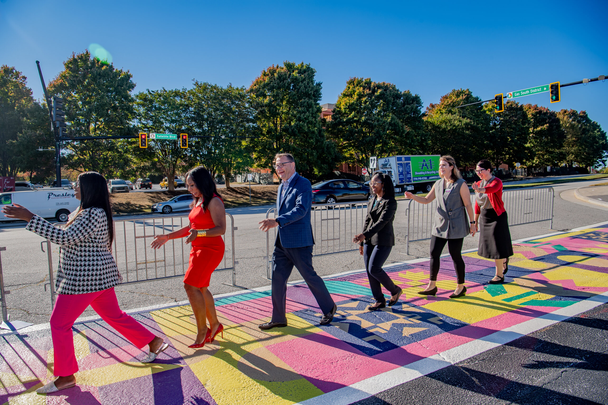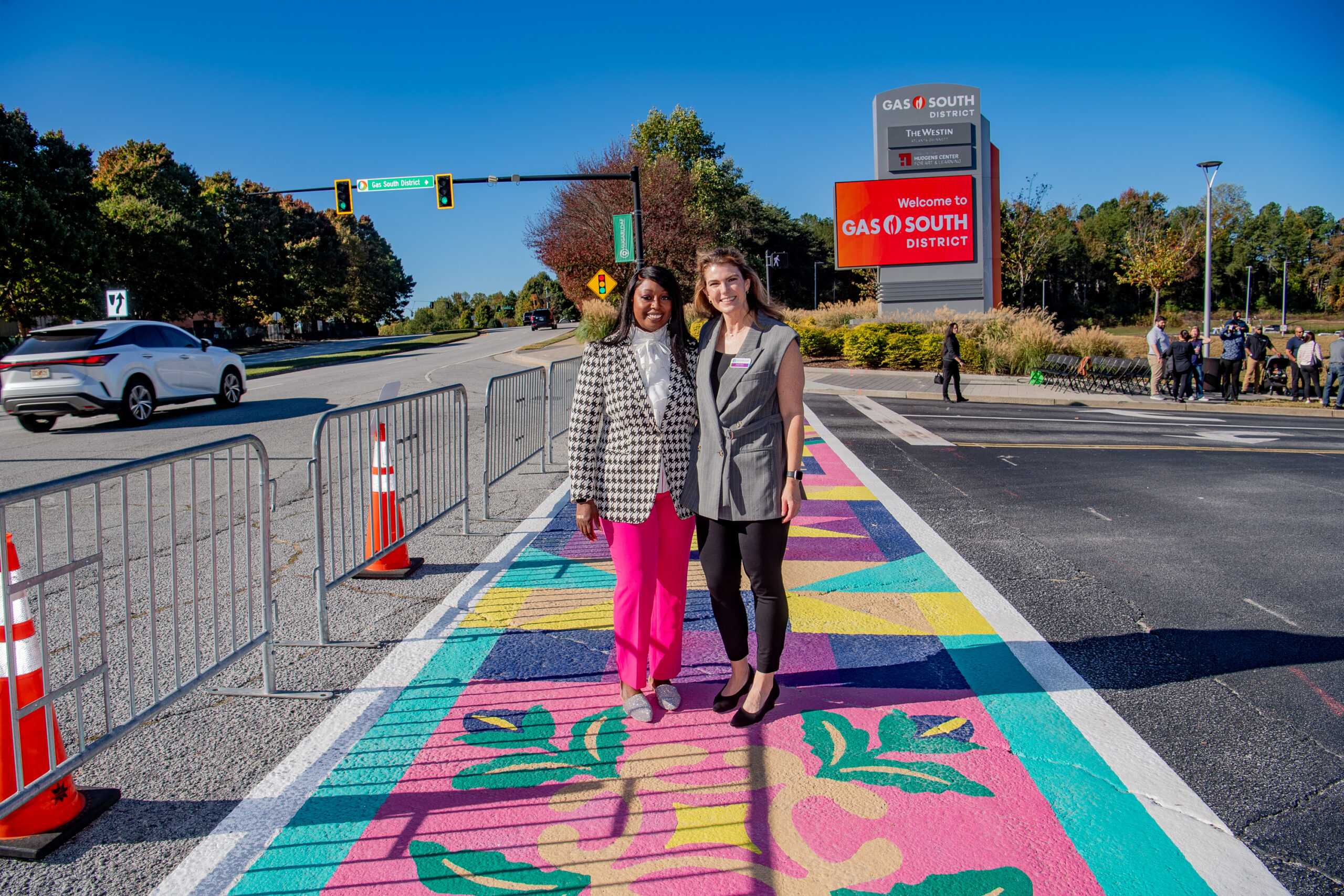 The crosswalk adds vibrancy to Satellite Blvd., improves safety and visibility for pedestrians and transit riders, and also serves as a symbolic gateway to the diverse programming and cultural experiences offered year–round at Gas South District.