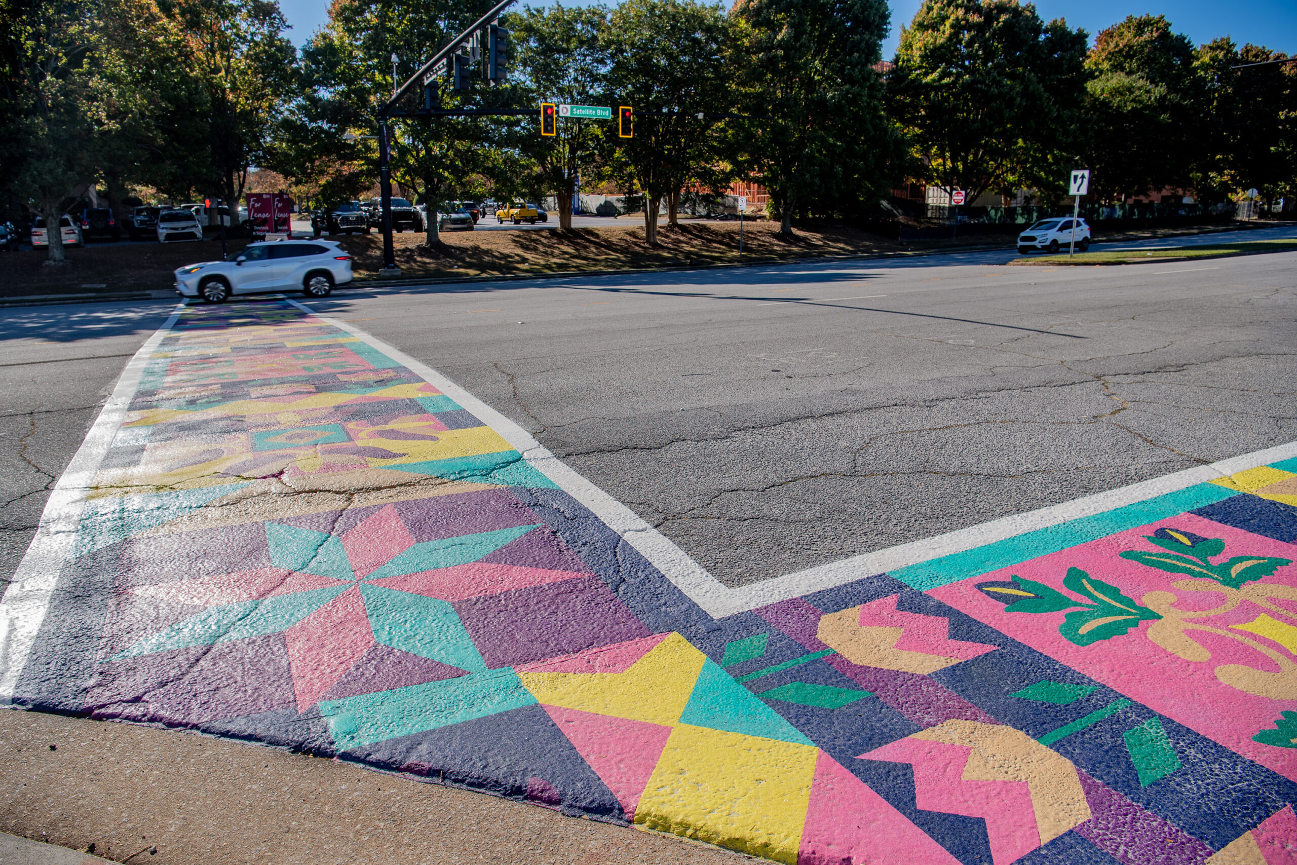 Following a Call for Artists through the Sugarloaf CID, in partnership with the Hudgens Center for Art & Learning, a committee representing 5 local organizations reviewed over 20 artist submissions. A local artist and educator, Alexandra Sorto, was chosen to bring the project to life with her Quilt design. Sorto, a Gwinnett resident and art teacher with the Gwinnett County Public School System, has deep ties to the community and has also completed projects with the City of Suwanee, The Rooftop Bar in Sugar Hill, and Twin Cities Pizza in Suwanee. Geveko Markings provided the preformed thermoplastic material for the crosswalks, which were installed by Big Apple Services.