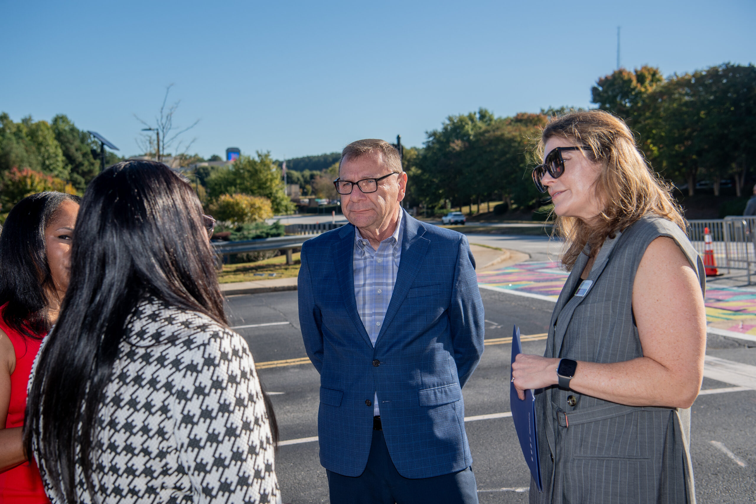 DULUTH, Ga. (October 14, 2025) – An official ribbon-cutting for the vibrant artistic crosswalks on Satellite Blvd. at the entrance of Gas South District took place today. County officials, venue and community partners, and local leaders gathered to celebrate the project. Gwinnett Convention and Visitors Bureau and Gas South District’s Chief Executive Officer & President Stan Hall and Sugarloaf Community Improvement District Board Members led the ribbon cutting alongside representatives from Gwinnett County and the Hudgens Center for Art & Learning.