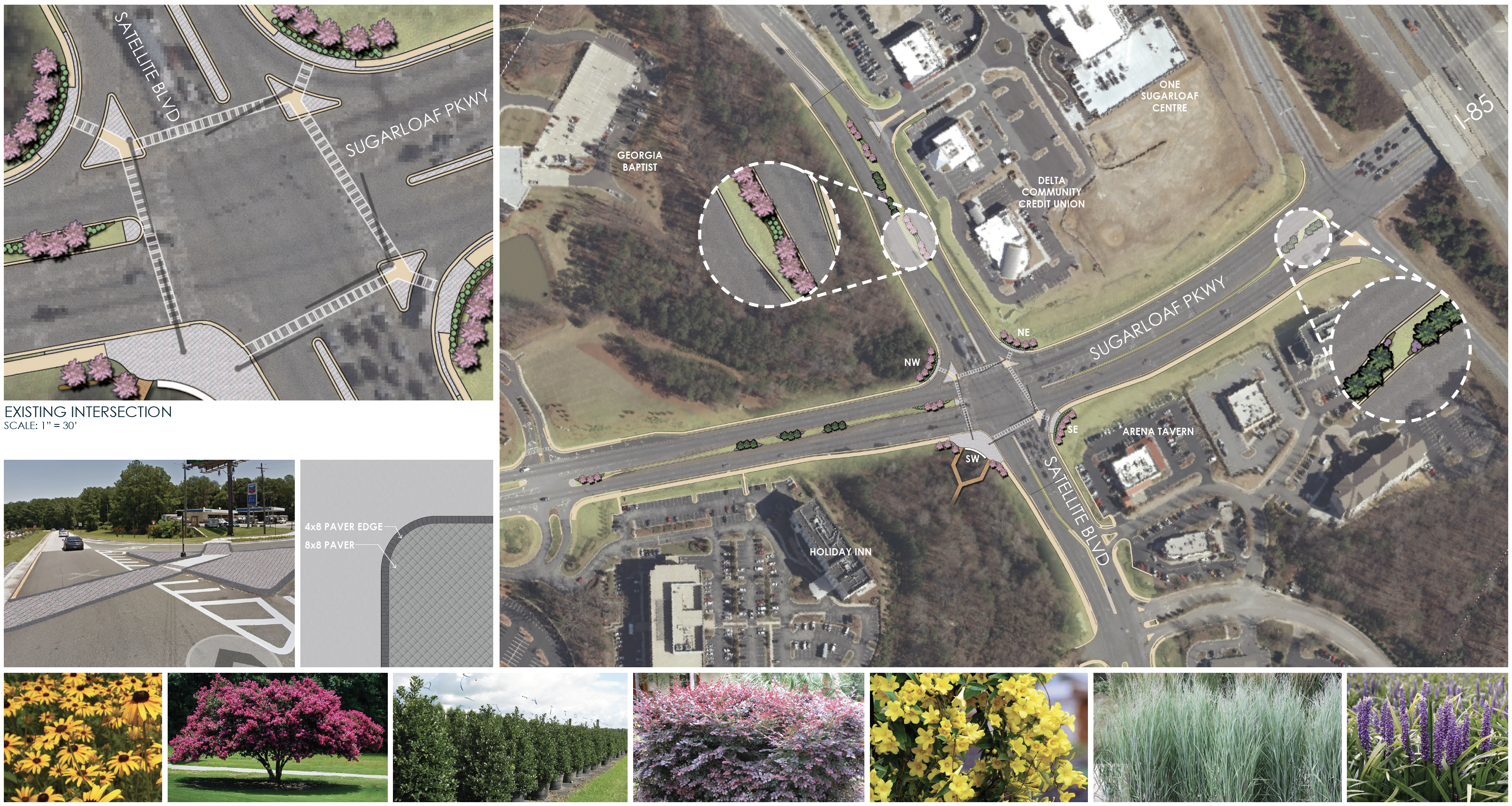 Traffic flow and aesthetic improvements to the intersection of Sugarloaf Parkway at Satellite Boulevard along with the widening of Sugarloaf Parkway from I-85 up to the new signal at the Gas South District parking deck entrance.