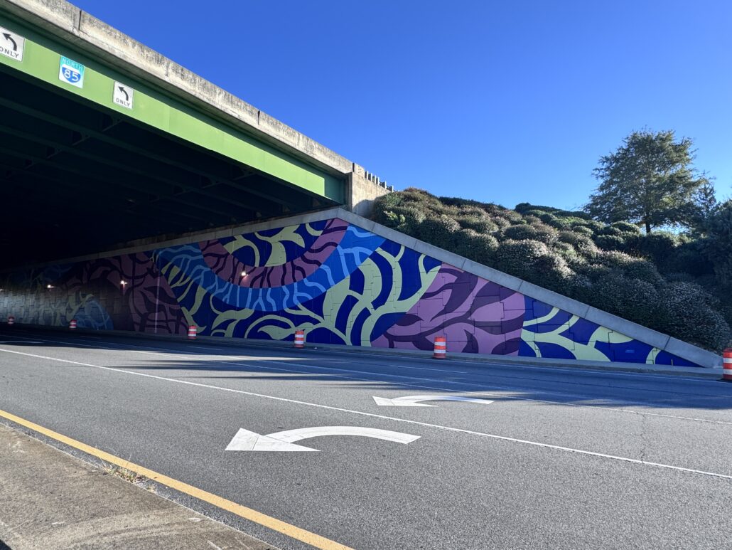Spanning both sides of the underpass, the murals surround drivers and pedestrians with sweeping patterns of color inspired by nature, movement, and the area’s vitality. Each section was designed by Jones and completed in two phases—the North Wall in July 2024 and the South Wall in October 2025.